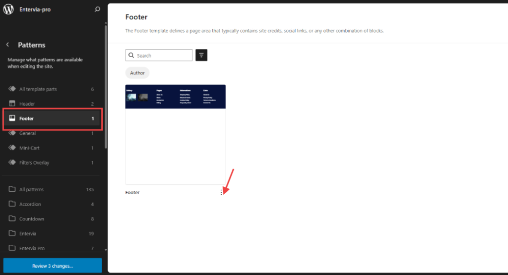 - Click the footer template in the bottom-right corner, then select the three dots icon and choose Edit.