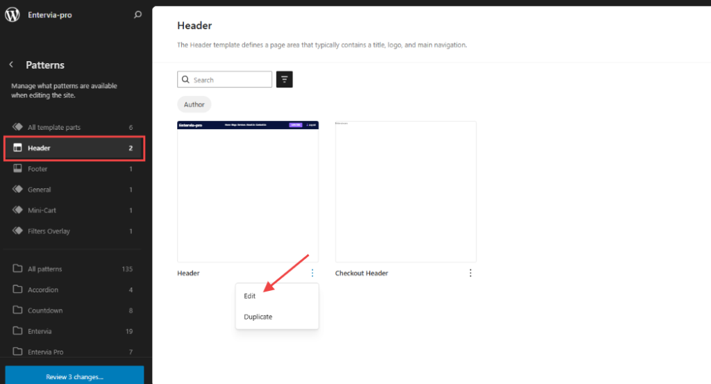 - Click the header template in the bottom-right corner, then select the three dots icon and choose Edit.