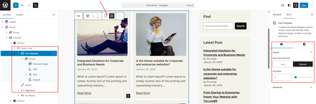 - Identify the Query Loop Block: In the editing page, locate the Query Loop block. This block dynamically fetches and displays posts based on specified parameters.
